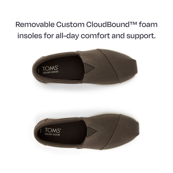 Impactful Alpargata slip-ons with signature TOMS style, now available in waxed recycled cotton uppers. Easygoing and casual in canteen green, these go-to shoes pair well with jeans, tees and everything in between. Recycled cotton upper-made with at least 50% recycled cotton which helps keep waste out of landfills and requires less water and energy than conventional cotton.