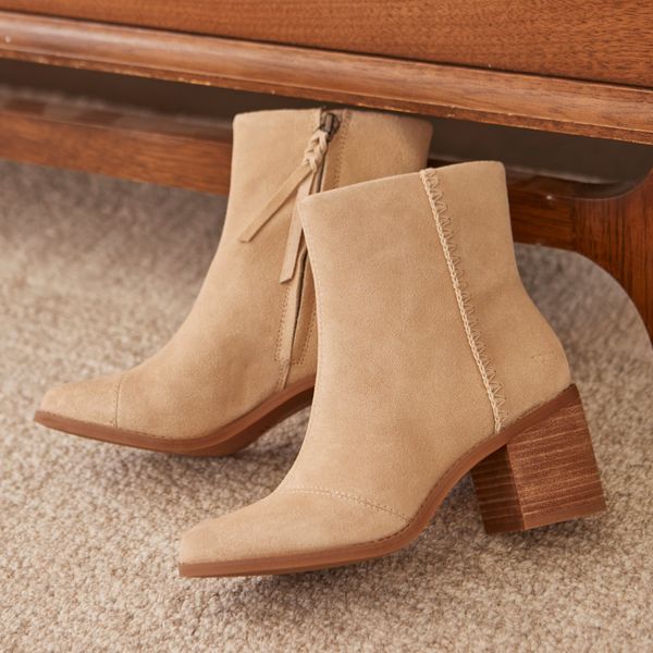 Feel good and do good in the Evelyn boot. This style instantly elevates your look with oatmeal suede uppers, deco stitching and a stacked heel. Fitted with CloudBound™ insoles for comfort and support on days when you need it most.Suede uppers. TOMS leather products support responsible manufacturing via the Leather Working Group.