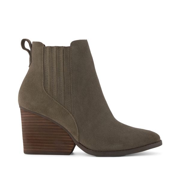 Rise above in the vintage-inspired Noa ankle boot. A sculpted leather-wrapped wedge gives this Chelsea boot the perfect amount of lift, offset by versatile olive suede uppers. CloudBound™ insoles provide support and feel as light and comfy as a cloud so you can float through your day with ease. Suede uppers. TOMS leather products support responsible manufacturing via the Leather Working Group.